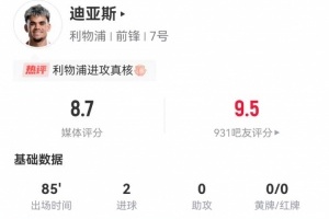 體育資訊12月23日訊 利物浦在本輪英超6-3擊敗熱刺,迪亞斯本場數(shù)據(jù)如下: