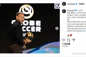 內(nèi)馬爾在社交媒體上曬出領(lǐng)獎(jiǎng)的照片,并寫道:“我要感謝我的家人、朋友、隊(duì)友、教練和球迷。”