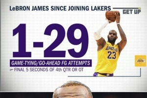據(jù)ESPN統(tǒng)計(jì),自加盟湖人以來(lái),詹姆斯比賽最后5秒內(nèi)的扳平或反超球共計(jì)29中1。