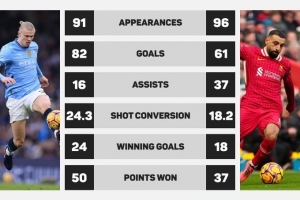 體育資訊2月21日訊 OPTA統(tǒng)計(jì)了薩拉赫和哈蘭德過(guò)去三個(gè)賽季的進(jìn)球數(shù)據(jù),兩人都在英超參與了98個(gè)進(jìn)球,分別為曼城和利物浦贏得50分和37分。