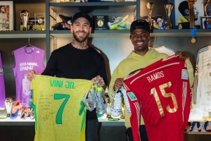 皇馬邊鋒維尼修斯也在近日拜訪了前輩拉莫斯的家,兩人交換國家隊球衣并合影留念。
