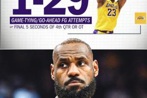 體育資訊02月21日訊 ESPN節(jié)目組《Get Up》的統(tǒng)計(jì),自從加盟湖人之后,詹姆斯在第四節(jié)或是加時賽的最后5秒鐘里的追平或者反超球的出手,截至目前是29投1中。