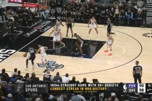 本場比賽,馬刺全隊已經(jīng)送出了29記助攻,這是馬刺連續(xù)第193場送出20+助攻,NBA歷史最長紀錄。
