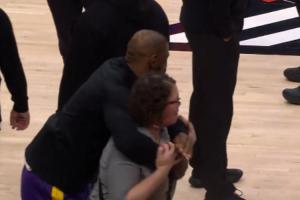 體育資訊02月21日訊 NBA常規(guī)賽,湖人110-102擊敗開拓者,賽前詹姆斯突然跑去擁抱一位開拓者女服務(wù)員。