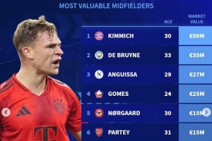 體育資訊2月21日訊 《轉(zhuǎn)會(huì)市場(chǎng)》統(tǒng)計(jì)了合同今年到期的中場(chǎng)球員身價(jià)情況,基米希身價(jià)最高。