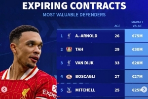 體育資訊2月21日訊 《轉(zhuǎn)會(huì)市場(chǎng)》列出了合同今年到期的后衛(wèi)球員身價(jià)情況,阿諾德斷崖領(lǐng)跑。