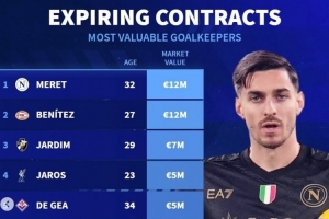 體育資訊2月21日訊 《轉(zhuǎn)會(huì)市場(chǎng)》統(tǒng)計(jì)了今年合同到期的門(mén)將身價(jià)情況,那不勒斯門(mén)將梅雷特并列居首。