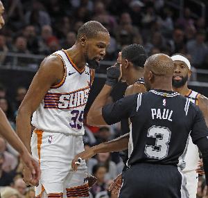 體育資訊02月22日訊 昨日太陽(yáng)不敵馬刺的比賽,杜蘭特跟保羅在比賽中斗嘴,吵了很久,裁判都聽(tīng)煩了,給了他倆一人一個(gè)技犯。