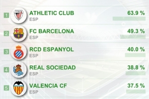 體育資訊2月22日訊 瑞士足球天文臺統(tǒng)計了本賽季五大聯(lián)賽球隊自家青訓(xùn)球員的出場時間占全隊的比例,并列出榜單,畢爾巴鄂63.9%居首,巴薩49.3%第二,前5名皆為西甲球隊。