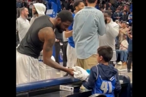 賽后,歐文在退場(chǎng)時(shí)將自己身上的原味兒球衣送給了場(chǎng)邊的一位小球迷。