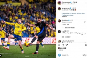 費蘭-托雷斯社媒曬出自己射門瞬間的照片,配文:“這是鯊魚時刻????”