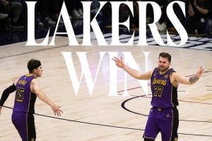 賽后,湖人官方曬出贏球海報(bào),東契奇和里夫斯登上封面。