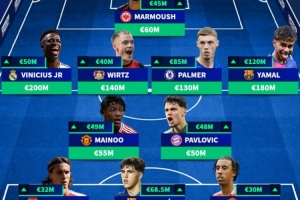 中場:維尼修斯(皇馬,2億歐,+5000萬歐)、梅努(曼聯(lián),5500萬歐,+4000萬歐)、帕夫洛維奇(拜仁,5000萬歐,+4800萬歐)、帕爾默(切爾西,1.3億歐,+8500萬歐)、維爾茨(勒沃庫森,1.4億歐,+4000萬歐)、亞馬爾(巴薩,1.8億歐,+1.2億歐)