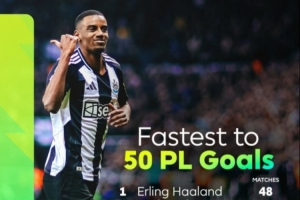 英超官方盤點了最快達成50粒英超進球榜單,其中伊薩克排在第7位,具體如下: