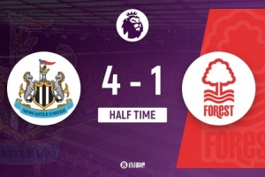 上半場比賽結(jié)束,紐卡斯?fàn)柭?lián)4-1諾丁漢森林。