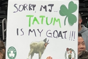 賽前,綠軍主場球迷舉牌,上面貼著塔圖姆頭像的山羊和綠軍隊徽,配文寫道:“對不起了MJ(喬丹),塔圖姆才是我心目中的GOAT(山羊,歷史最佳之意)?!?/p>