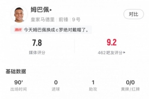 體育資訊2月24日訊 本輪西甲,皇馬2-0赫羅納。姆巴佩全場(chǎng)數(shù)據(jù):