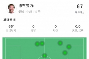 體育資訊2月24日訊 本輪英超比賽,曼城對(duì)陣?yán)锲?,德布勞?nèi)本場(chǎng)數(shù)據(jù):