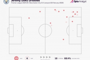 根據(jù)統(tǒng)計(jì),多庫(kù)本場(chǎng)19次嘗試過人、13次成功,兩項(xiàng)數(shù)據(jù)均是英超本賽季的紀(jì)錄。
