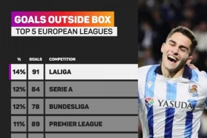 體育資訊2月24日訊 根據(jù)Opta的數(shù)據(jù),西甲本賽季649粒進(jìn)球中有91粒來自于禁區(qū)外,占比14%是五大聯(lián)賽最多的。
