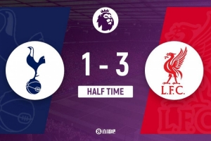上半場(chǎng)補(bǔ)時(shí)2分鐘,熱刺1-3利物浦。