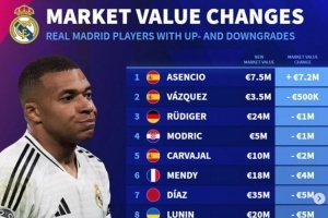 德轉(zhuǎn)列皇馬身價變動:歐元