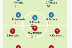 前鋒:巴爾科拉5分、登貝萊7分、克瓦拉茨赫利亞7分