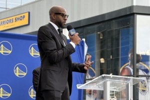而我們現(xiàn)在所在的地方,就是一個(gè)成功運(yùn)營(yíng)的典范。當(dāng)他們買下球隊(duì)時(shí),他們告訴我們,他們會(huì)掛上冠軍旗幟,而他們確實(shí)做到了。所以讓我們來聽聽這兩位——讓勇士成為全球知名品牌的兩位人士的發(fā)言。