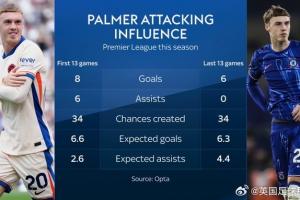 天空體育:帕爾默在過去13場(chǎng)英超比賽中創(chuàng)造了34次機(jī)會(huì),預(yù)期助攻為4.4,但實(shí)際沒有收獲一個(gè)助攻??