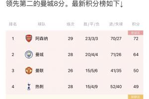 2022/23賽季英超,阿森納到第29輪時(shí)一度多賽一場(chǎng)領(lǐng)先曼城8分,但收官時(shí)曼城卻反超阿森納5分奪冠。