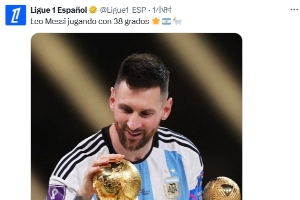 體育資訊12月29日訊 昨日的環(huán)足頒獎典禮,C羅再次表示沙特聯(lián)比法甲更好,并提到在沙特踢球時(shí)氣溫高達(dá)38、39度。法甲西語官推曬出梅西撫摸大力神杯的照片回?fù)鬋羅:“梅西在38℃高溫下踢球????????”