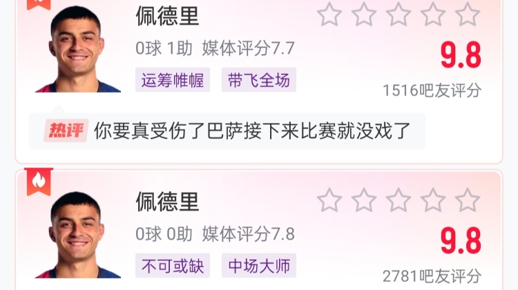 過去8場比賽,佩德里打進(jìn)1球并有3次助攻,吧友評(píng)分場均達(dá)高達(dá)9.65分,最低也有9.3分。