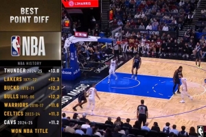 本賽季雷霆場均凈勝分+13,暫列NBA歷史第一。而歷史排名前六的另外五支球隊均當季奪冠。具體如下: