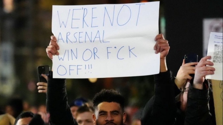 一名球迷的標語上寫著: “我們不是阿森納。要么贏,要么滾!”
