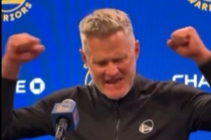 在賽后新聞發(fā)布會(huì)上,得知球隊(duì)升至西部第8后,勇士主帥科爾握拳慶祝。