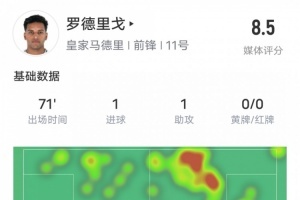 體育資訊12月23日訊?西甲第18輪,皇馬對(duì)陣塞維利亞,羅德里戈本場(chǎng)比賽首發(fā)出戰(zhàn),傳射建功,另外他還送出2次關(guān)鍵傳球,評(píng)分8.5。