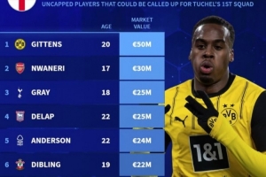 體育資訊2月27日訊 《轉(zhuǎn)會(huì)市場(chǎng)》統(tǒng)計(jì)了當(dāng)前仍未被征召的英格蘭球員最貴身價(jià)情況,多特邊鋒吉滕斯領(lǐng)銜。