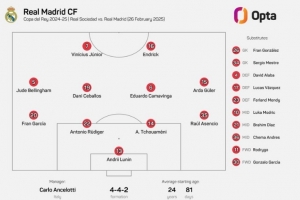 體育資訊2月27日訊 國王杯半決賽首回合皇馬對陣皇家社會的比賽即將開始,雙方首發(fā)陣容公布。