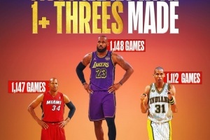 據(jù)統(tǒng)計,本場比賽過后,詹姆斯生涯至今已經(jīng)有1148場比賽至少命中1記三分,超越雷-阿倫(1147)獨霸歷史第一,雷吉-米勒(1112場)排名歷史第三。