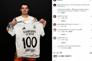 這也是迪亞斯為皇馬各項(xiàng)賽事出戰(zhàn)的第100場(chǎng)比賽,賽后他也在個(gè)人社媒曬出與100場(chǎng)紀(jì)念球衣的合影,配文寫(xiě)道:“很高興能為世界最佳俱樂(lè)部完成100次出場(chǎng),一個(gè)夢(mèng)想實(shí)現(xiàn)了。美好的瞬間永存,讓我們?nèi)?zhēng)取更多!感謝皇馬球迷的支持!”