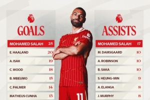 利物浦社媒曬出了薩拉赫本賽季聯(lián)賽數(shù)據(jù)海報(bào),目前這名前鋒進(jìn)球數(shù)、助攻數(shù)均領(lǐng)跑英超。