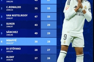 體育資訊2月27日訊 姆巴佩在皇馬效力的首個(gè)賽季目前各項(xiàng)賽事已經(jīng)打進(jìn)28球,距離皇馬隊(duì)史首秀賽季進(jìn)球數(shù)紀(jì)錄還有9球,以下為具體榜單: