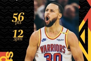 全場,庫里25中16(三分19中12)、罰球12中12,瘋狂砍下56分4板3助2斷!