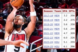 體育資訊3月1日訊 據(jù)火箭記者Bradeaux統(tǒng)計(jì),本賽季狄龍-布魯克斯的場均三分出手?jǐn)?shù)及三分命中率皆生涯新高。