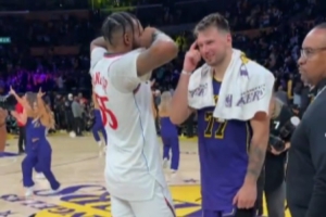 賽后,湖人球星東契奇和快船球員小德里克-瓊斯來到場中央,兩名昔日獨行俠隊友進(jìn)行了一番寒暄并擁抱致意。