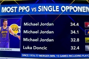 轉播方曬出一組數(shù)據(jù),自1976-77賽季聯(lián)盟合并以來,球員對陣單支球隊的場均得分榜如下(備注:至少打15場比賽、包含季后賽):
