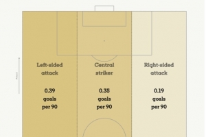 體育資訊3月1日訊 TA統(tǒng)計了羅德里戈在攻擊區(qū)域左路、中路和右路的進球效率區(qū)別,他在左路最高效。