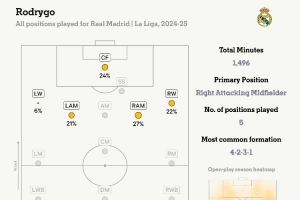 體育資訊3月1日訊 TA撰文談羅德里戈本賽季在皇馬的作用,據(jù)該媒體統(tǒng)計(jì),羅德里戈本賽季一共在皇馬的西甲比賽中踢過五個(gè)不同的位置。