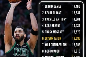 塔圖姆(25歲363天)在27歲前的總得分來到13390,超越張伯倫,暫列歷史第六。