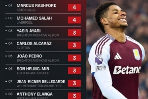 4次:拉什福德(維拉)、薩拉赫(利物浦)